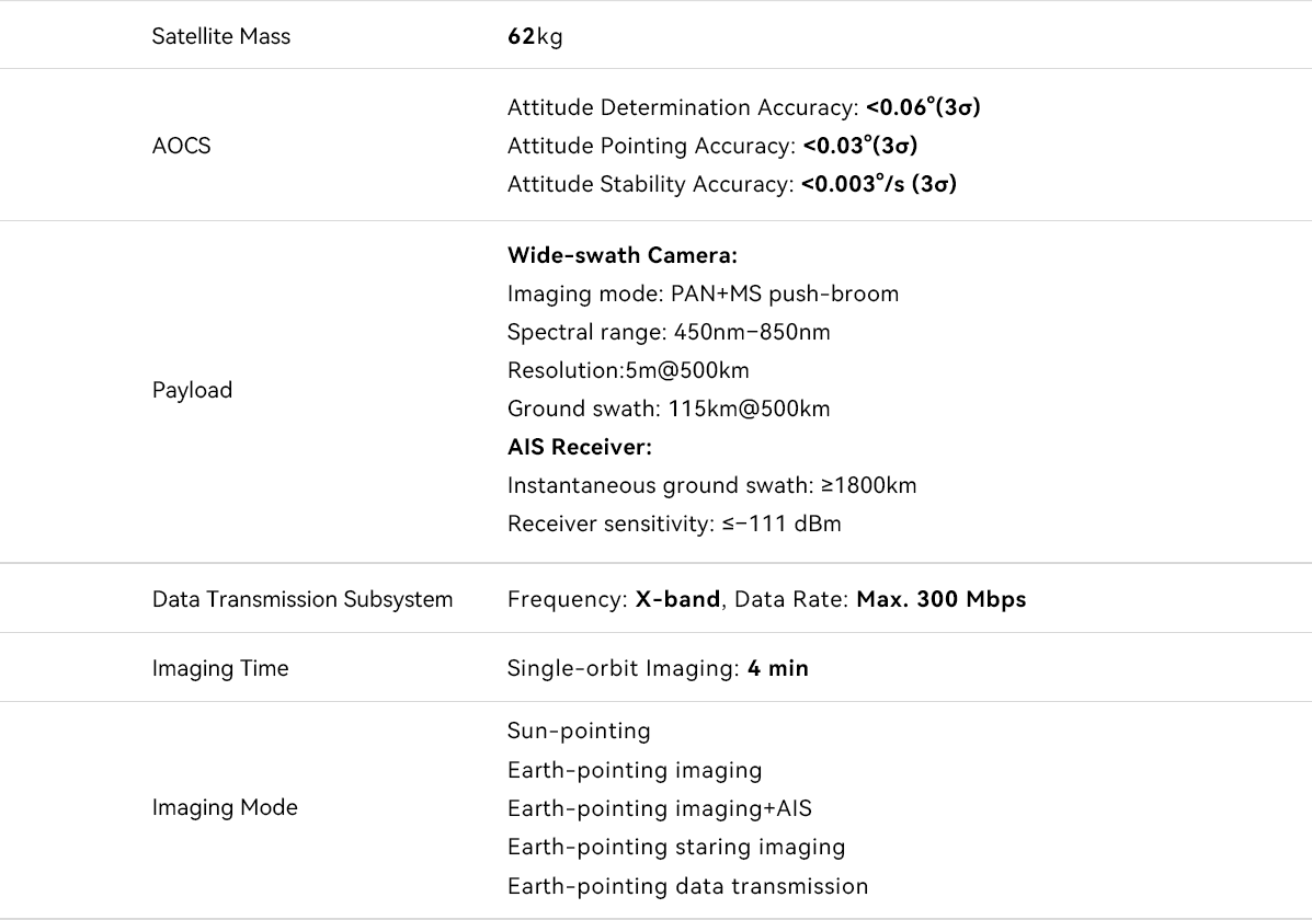 The satellite is equipped with on-board image processing capabilities, enabling direct identification of ship information from captured images through its onboard computing modules. This allows for data transmission without sending the entire image, greatly improving data transmission efficiency and enabling faster acquisition of critical information. Wenchang-1/02 satellite does not operate alone, it forms a network with the simultaneously launched Wenchang-1/01 satellite, significantly enhancing the observation efficiency and coverage capability for Hainan Island and its jurisdictional waters.